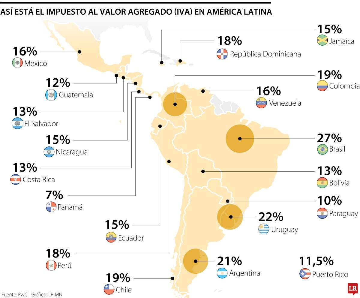 Según datos recolectados por Price Waterhouse Coopers, PWC, consultora de negocios, servicios de auditoría e impuestos, en América Latina,Brasil lidera el top de países con el impuesto al valor agregado más alto con 27%, seguido de Uruguay con 22%, Argentina con 21%; Colombia tiene el cuarto puesto con un IVA de 19%.