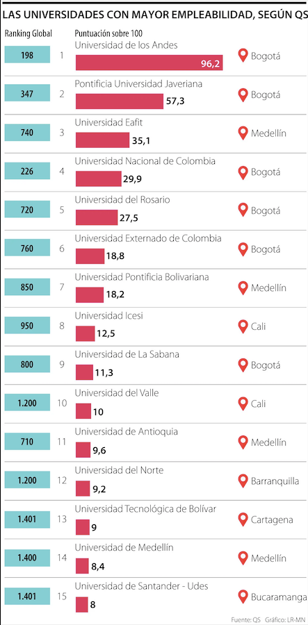 La Universidad de Los Andes alcanzó una puntuación de 96,2 sobre 100 y fue la mejor de las colombianas en esa área. Raquel Bernal, rectora de la institución, dijo a LR que “la clave para mantener un buen índice de empleabilidad radica en la capacidad de adaptación y evolución frente a los desafíos cambiantes del entorno laboral y educativo”.
