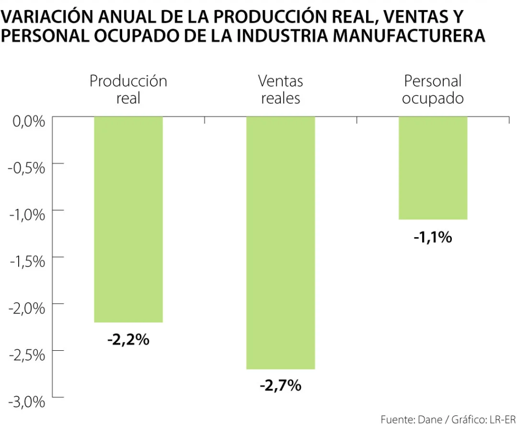 De acuerdo con el Dane,, la producción real cayó 2,2 %, mientras ventas reales retrocedieron 2,7 % y el personal ocupado cayó 1,1 %