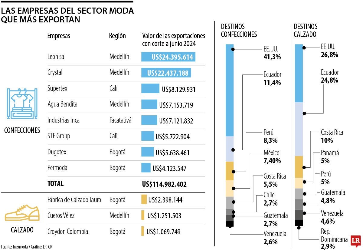 Con corte a junio de este año, las ventas internacionales de la industria de la moda colombiana, según Inexmoda, valieron US$738 millones y, al desagregarlo por segmento, los envíos de prendas confeccionadas totalizaron US$245 millones. En el top 10 de las exportaciones de prendas están, en su orden, Leonisa; Crystal (Gef y Punto Blanco); Supertex (Arena); Agua Bendita; Industrias Inca; STF Group (Studio F); Dugotex (Diane & Geordi); y Permoda (Koaj). En calzado, los líderes son Calzado Tauro, Cueros Vélez y Croydon.