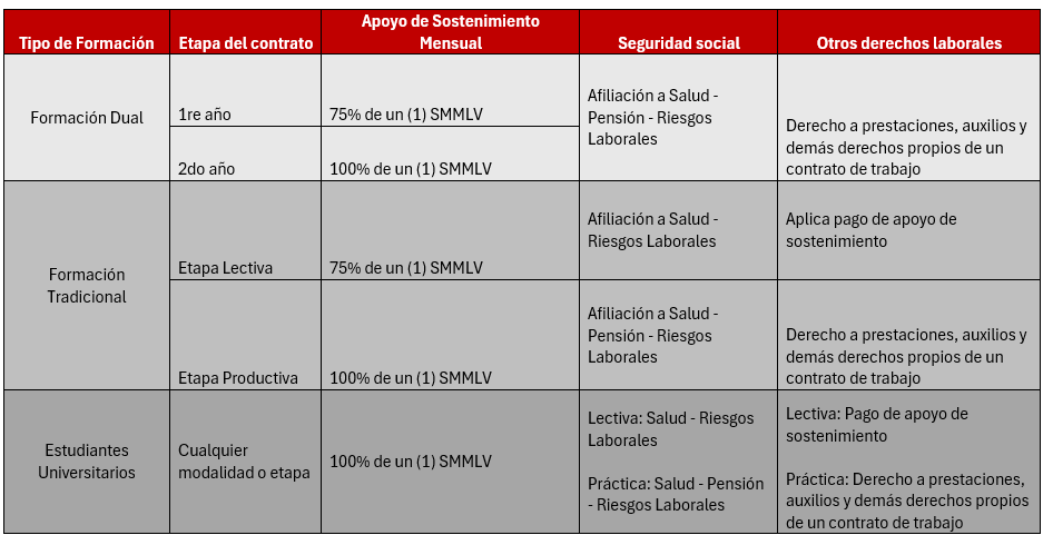 (v)Seguridad social en salud, pensiones y riesgos laborales; en etapa lectiva los aportes a salud y riesgos se encuentran a cargo del empleador; en etapa practica se presenta lo siguiente: